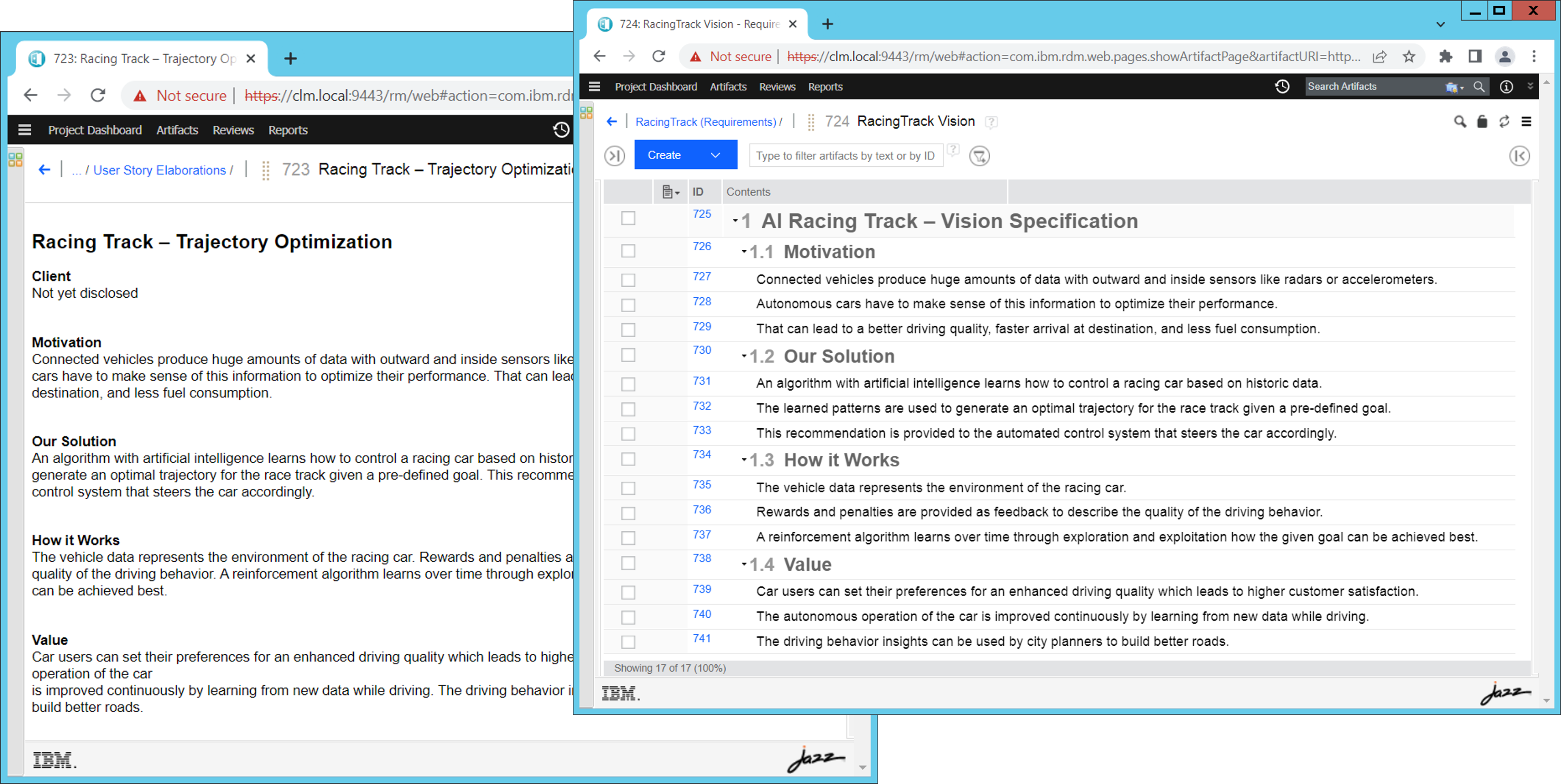 Ein sogenanntes Lifecycle Project kann aufgebaut werden, das Verbindungen zwischen den einzelnen Bereichen beinhaltet. Damit ist eine Traceability gegeben, die eine Transparenz über den Projektstand abbildet. Die sogenannten Artefakte sind über OSLC-Links verbunden und ermöglichen eine umfangreiche Analyse (z.B. Traceabilityanalyse oder Impaktanalyse bei Änderungen).